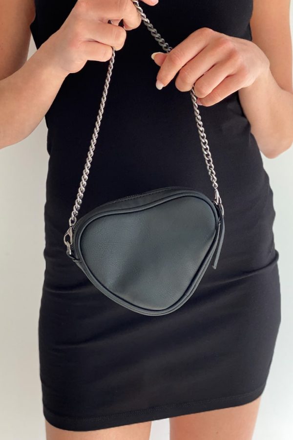 Borsa in ecopelle a cuore, con doppia tracolla, chiusura con zip, con tasca esterna.