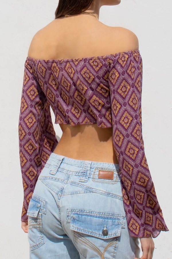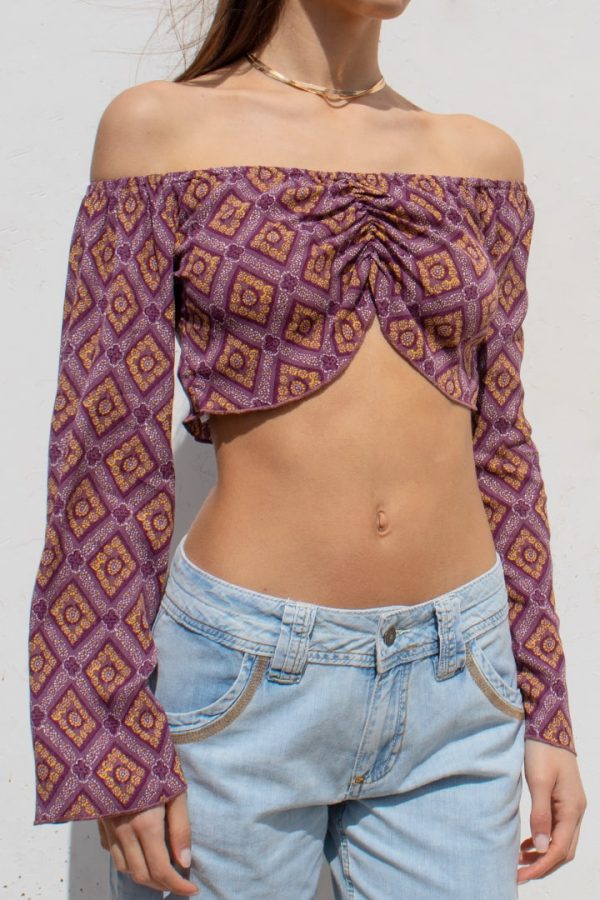 Blusa, maniche lunghe flare, spalle scoperte, con arricciatura, lunghezza crop, vestibilità slim.