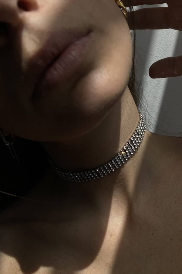 Choker con strass, lunghezza regolabile, chiusura con moschettone.