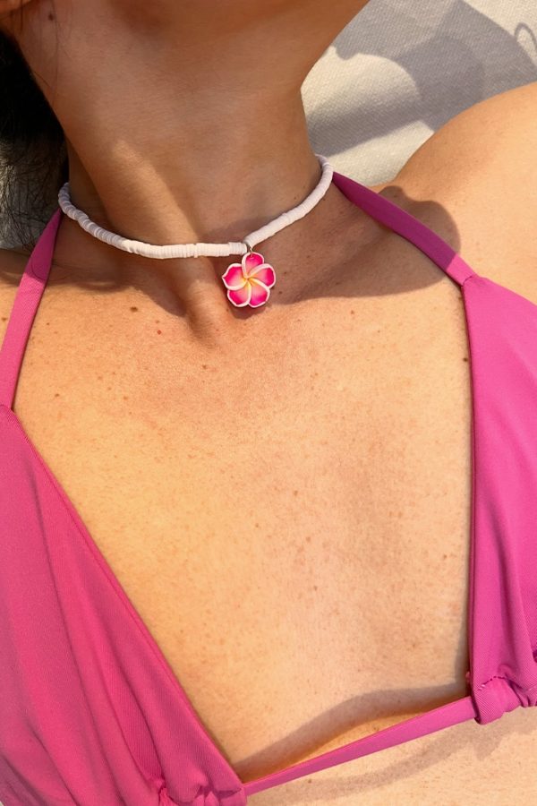Collana con fiore, chiusura con moschettone, con lunghezza regolabile.