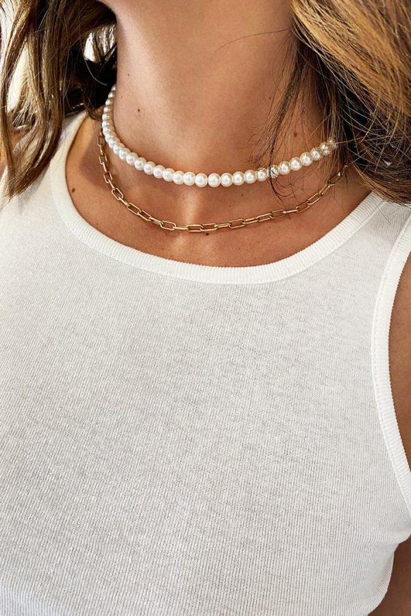 Collana di perle, chiusura con moschettone, lunghezza regolare.