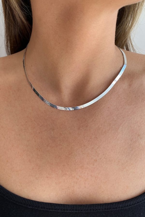 Collana piatta, chiusura con moschettone, con lunghezza regolabile.