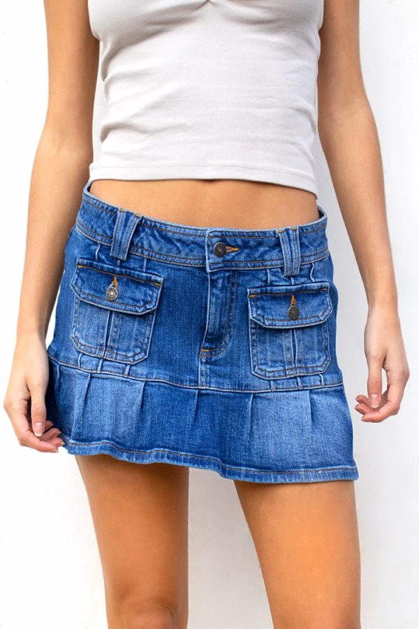 Gonna con tasche sul davanti, low waist, con balze, chiusura con bottone e zip, passanti per cintura, con tasche, lunghezza corta, vestibilità slim.