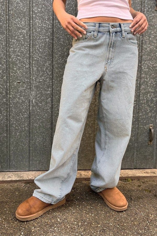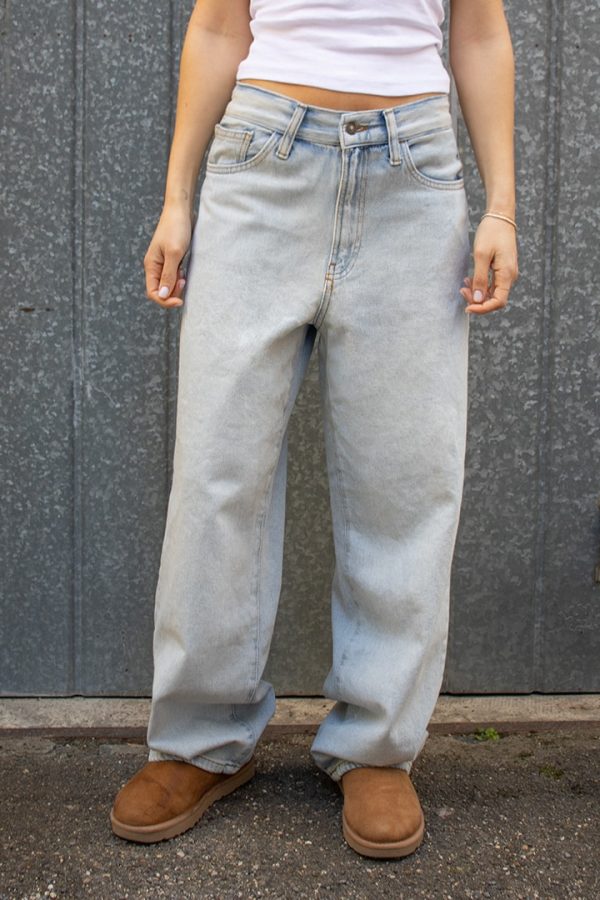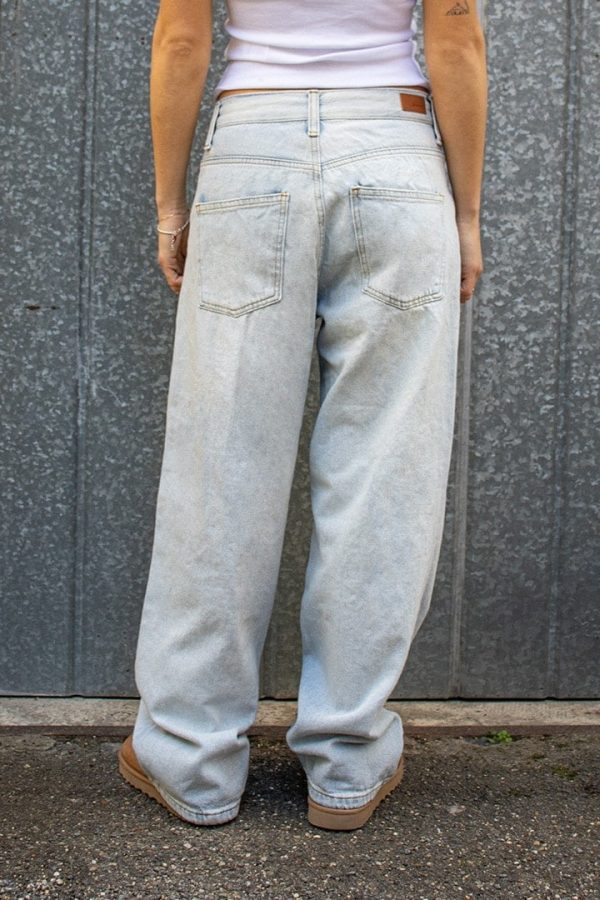 Jeans baggy, chiusura con bottone e zip, vita alta, modello a zampa, 4 tasche, passanti per cintura in vita, vestibilità comoda.