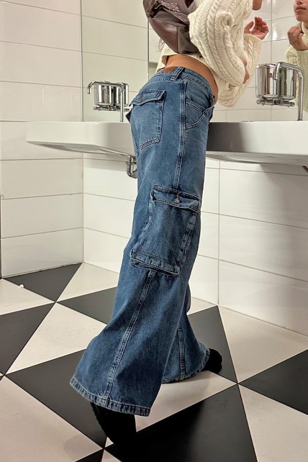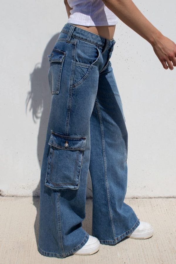 Jeans cargo, chiusura con zip e bottone, passanti per cintura, vita elasticizzata, tasche laterali e tasche sul retro, lunghezza regolare, vestibilità comoda.
