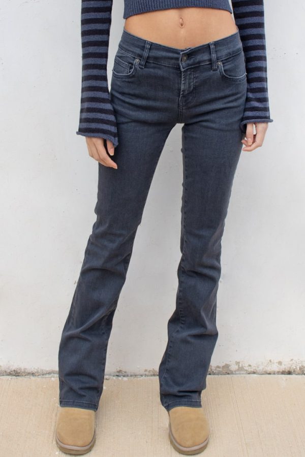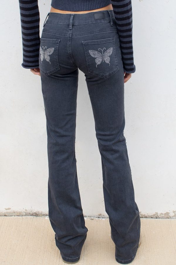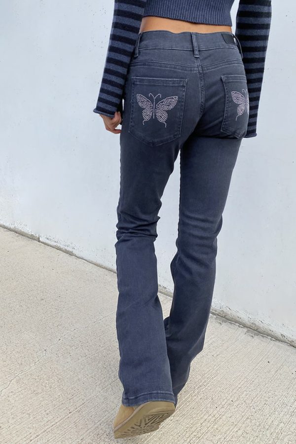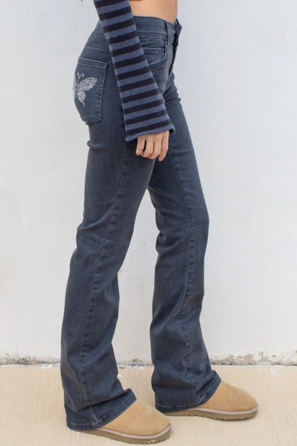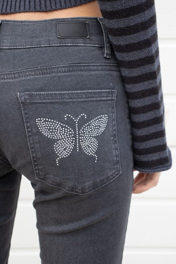 Jeans a zampa con farfalla strass, vita bassa, 4 tasche, passanti per cintura in vita, chiusura con bottone e zip, lunghezza regolare, vestibilità slim.