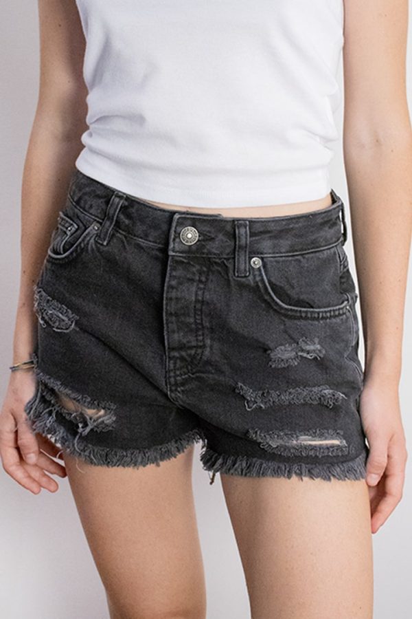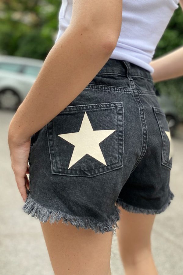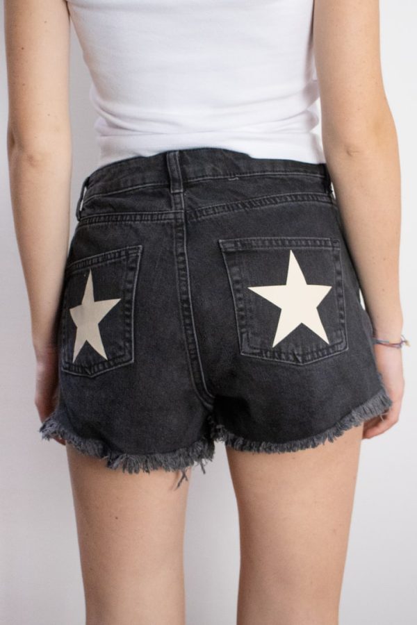 Shorts con strappi, stelle stampate sul retro, vita alta, passanti per cintura, chiusura con bottoni, taglio vivo sul fondo, lunghezza corta, vestibilità slim.