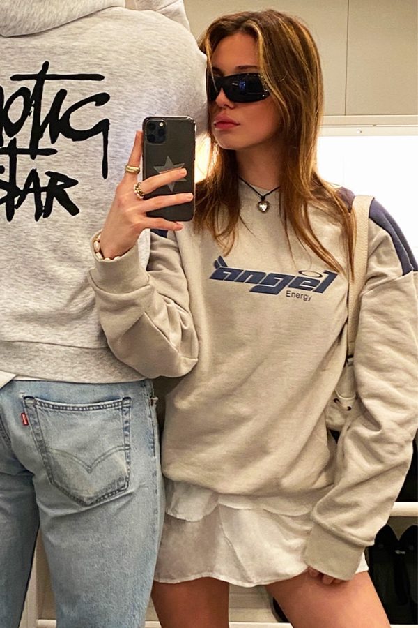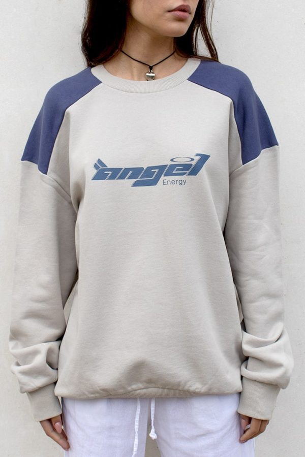Felpa con stampa Angel Energy, girocollo, maniche lunghe, lunghezza lunga, vestibilità comoda.
