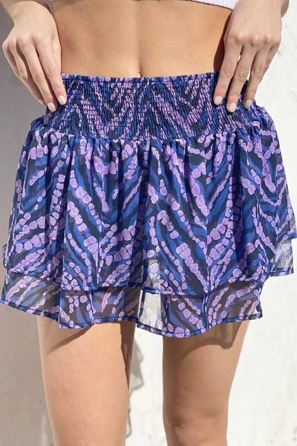 Gonna con balze, con fascia elastica, interno con pantaloncino, lunghezza corta, vestibilità comoda.