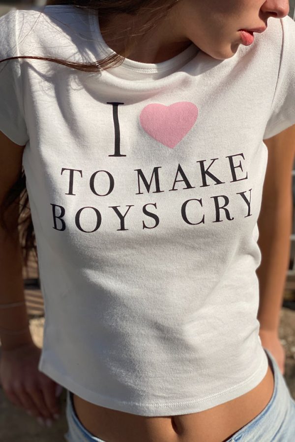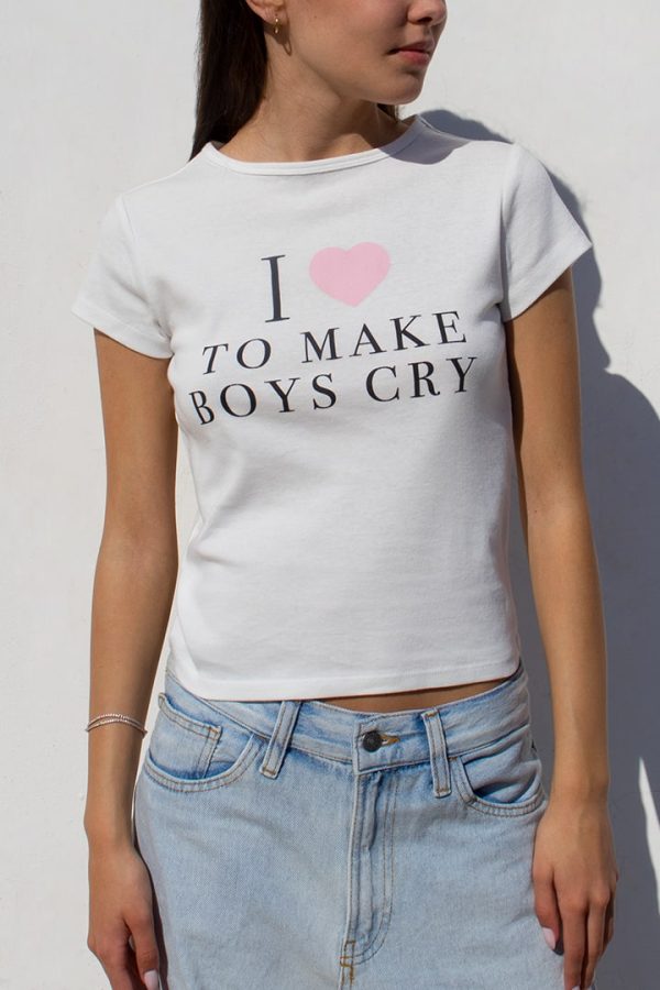 T-shirt con stampa I love to make boys cry, girocollo, maniche corte, lunghezza regolare, vestibilità comoda.