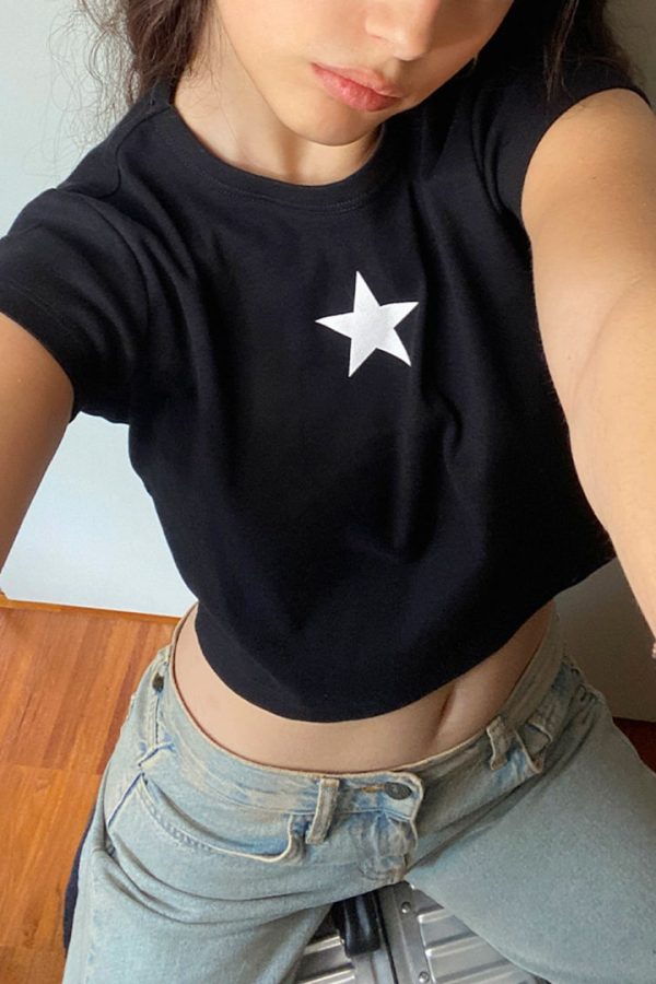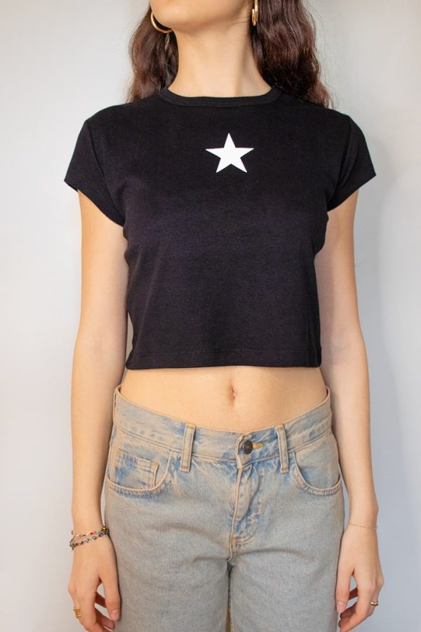 T-shirt con stampa stella, girocollo, maniche corte, lunghezza regolare, vestibilità comoda.