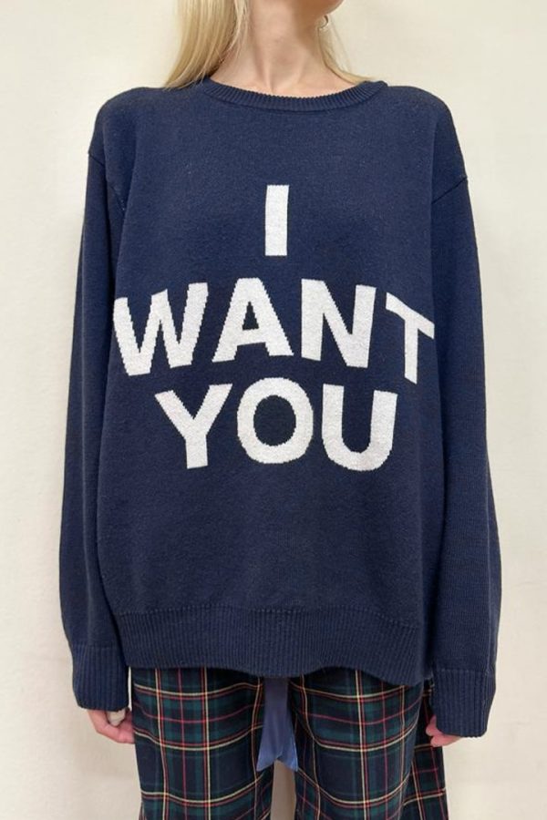 Maglione con stampa I want you, girocollo, maniche lunghe, lunghezza lunga , vestibilità oversize.