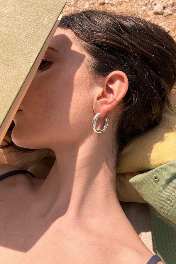 Orecchini, modello a cerchio, fascia spessa, chiusura a farfalla sul retro.