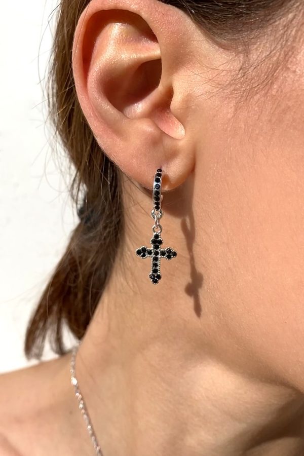 Orecchini cerchietto, con ciondolo croce e strass, con chiusura.