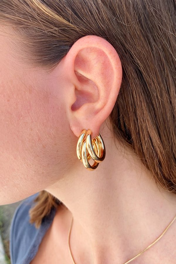 Orecchini, modello a triplo cerchio, fascia spessa, chiusura a farfalla sul retro.