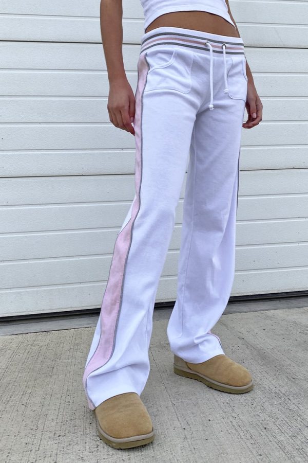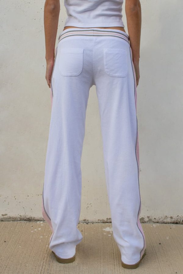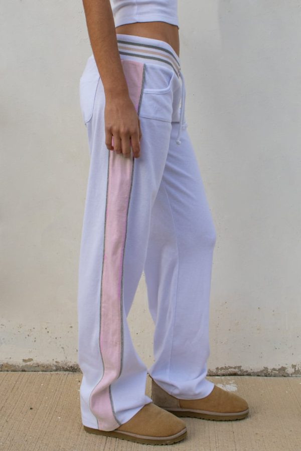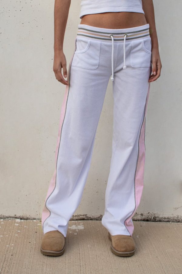 Pantaloni bande laterali, fascia elastica in vita, tasche laterali, lunghezza lunga, vestibilità comoda.