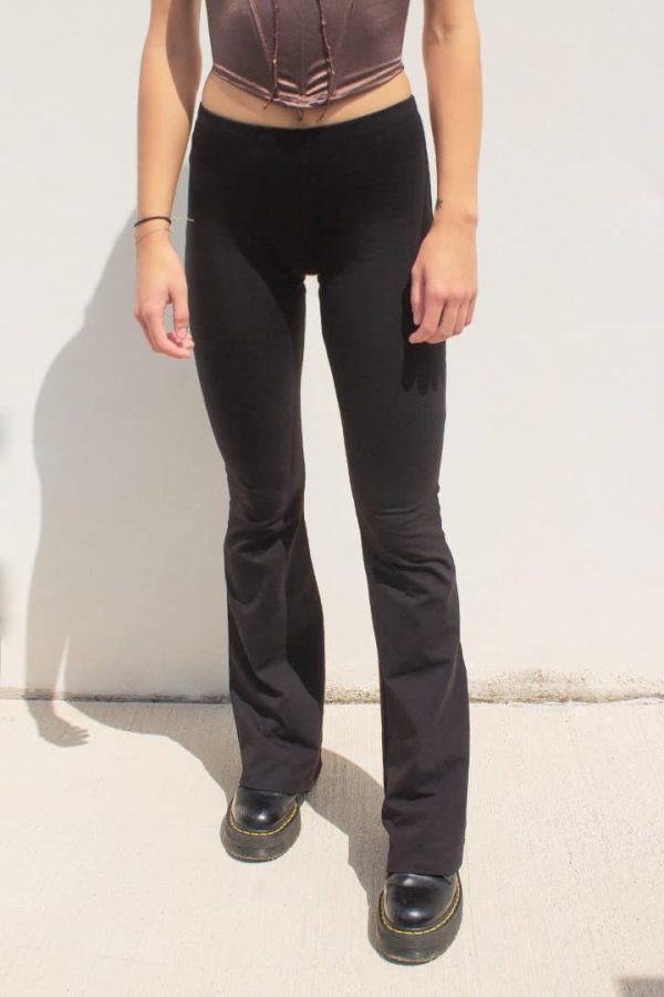 Pantaloni a zampa, fascia elastica in vita, lunghezza regolare, vestibilità comoda.