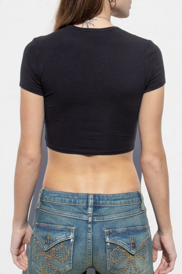 T-shirt girocollo, maniche corte, lunghezza crop, vestibilità aderente.