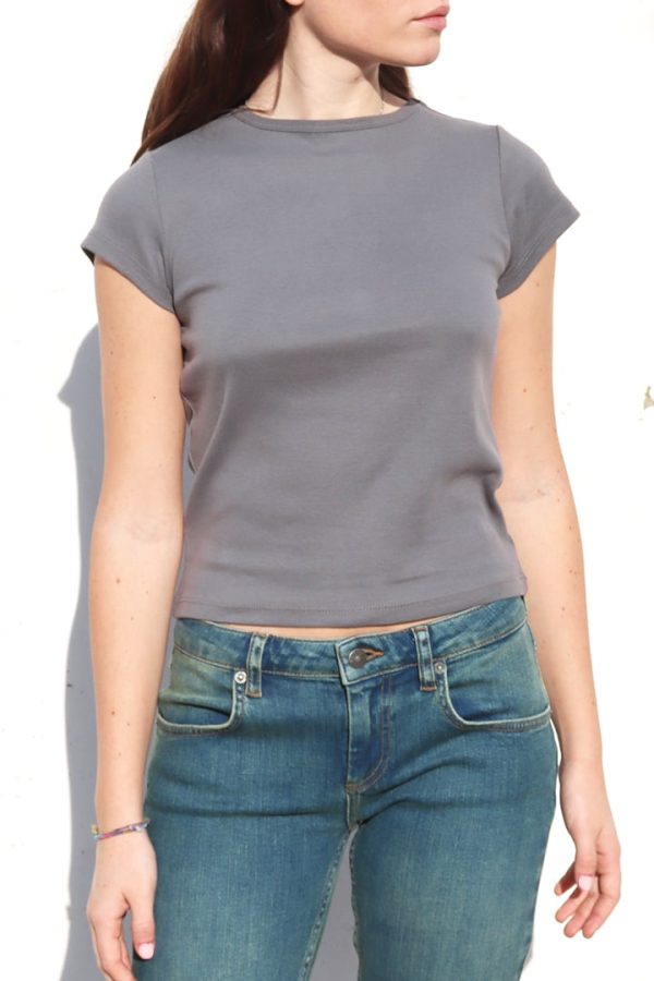 T-shirt girocollo, maniche corte, lunghezza corta, vestibilità comoda.