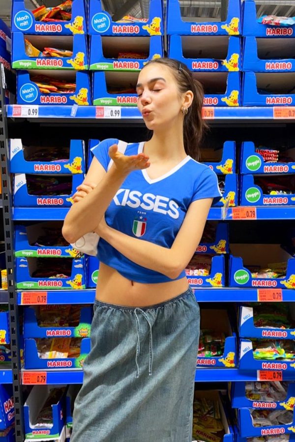 T-shirt con ricamo Kisses, scollo a V, maniche corte, lunghezza corta, vestibilità slim.
