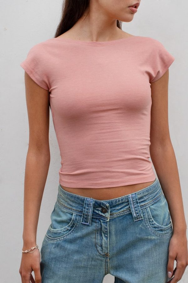 T-shirt con scollo a barchetta, maniche corte, con schiena scoperta, lunghezza corta, vestibilità comoda.