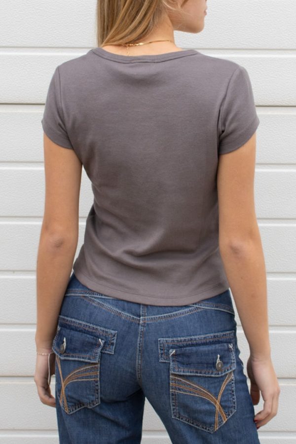 T-shirt scollo a V, maniche corte, lunghezza corta, vestibilità comoda.