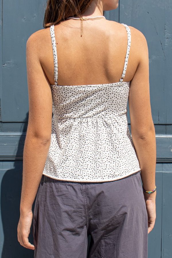 Tank top, con bottoncini e fili elastici sul davanti, con bretelline, lunghezza regolare, vestibilità comoda.