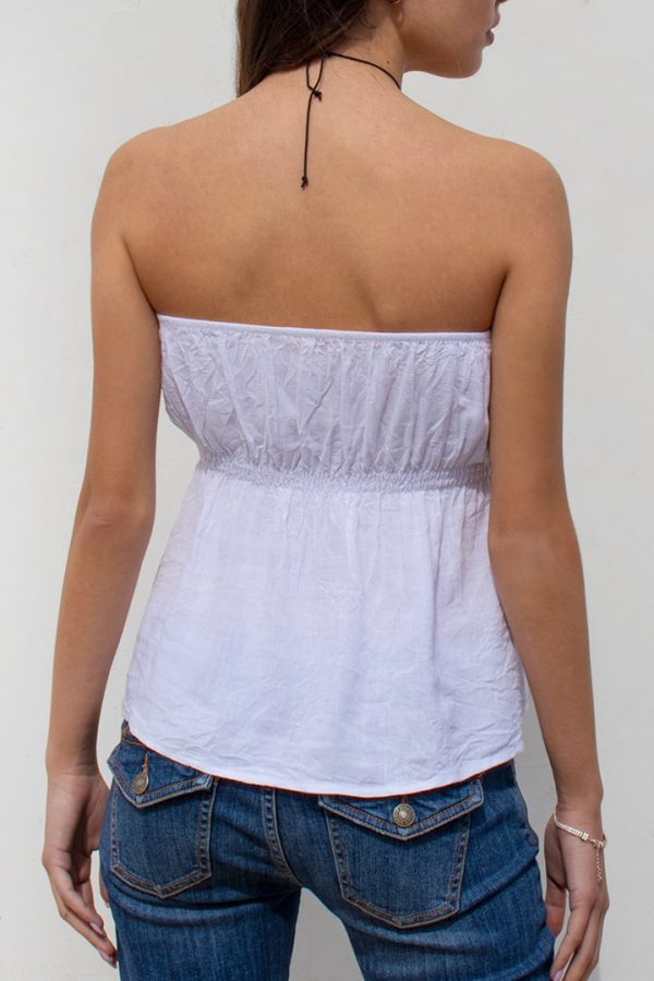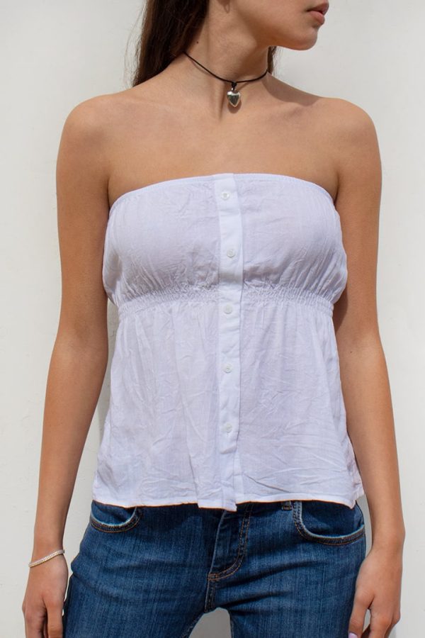 Top con bottoncini, scollo elasticizzato, lunghezza regolare, vestibilità comoda.