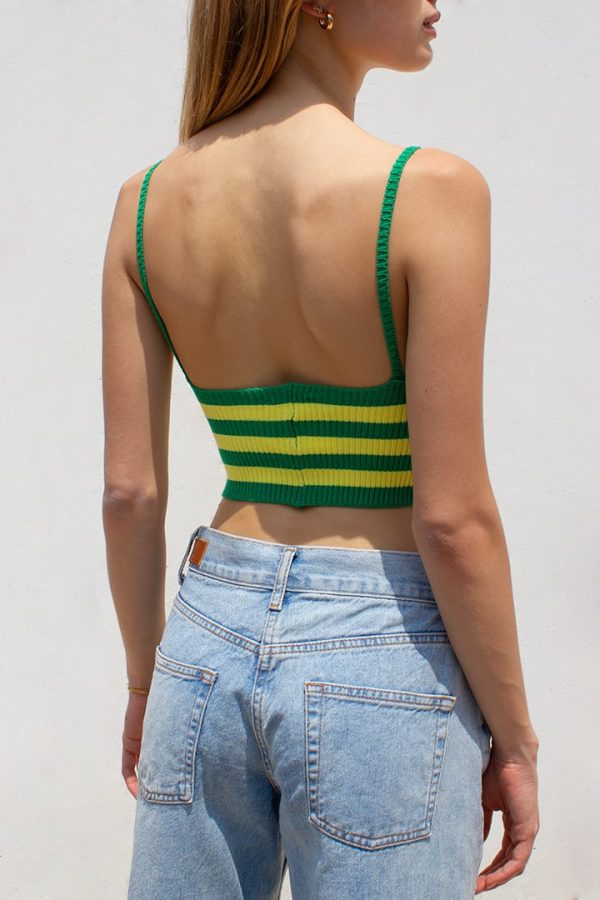 Top crochet, scollo a V, smanicato, lunghezza crop, vestibilità aderente.