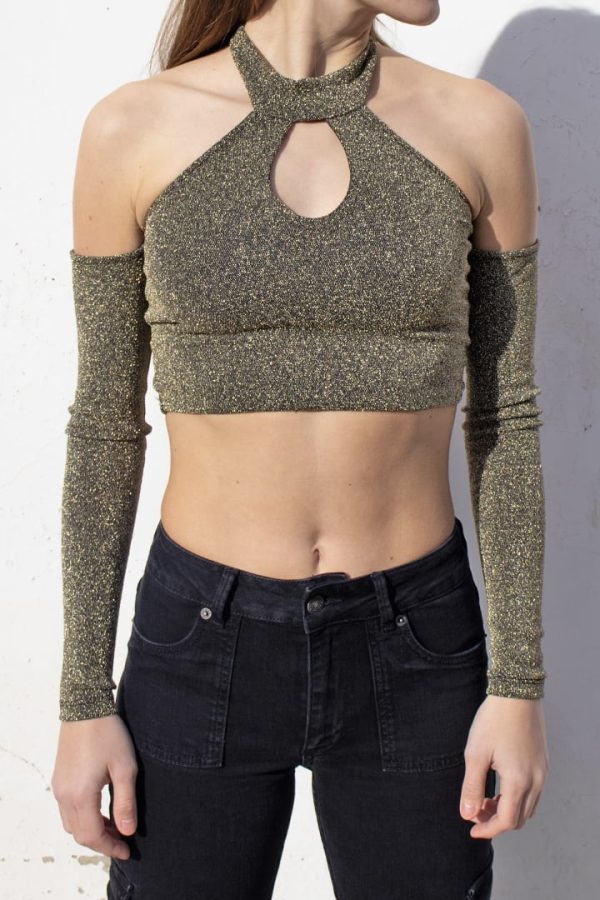 Top lupetto, con maniche, spalle scoperte, lunghezza crop, vestibilità aderente.