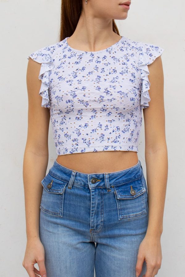 Top maniche a farfalla, girocollo, smanicato, lunghezza crop, vestibilità slim.