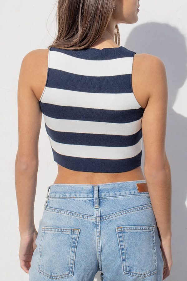 Top scollo a V, smanicato, tessuto elasticizzato, lunghezza corta, vestibilità aderente.