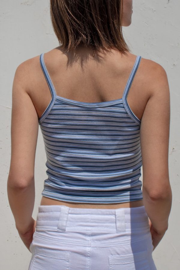 Top scollo rotondo, smanicato, lunghezza corta, vestibilità slim.