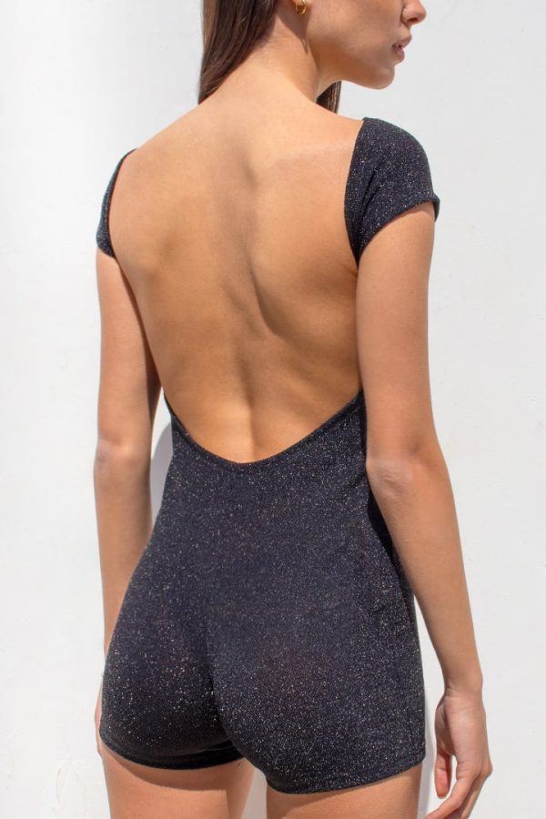 Jumpsuit schiena scoperta, maniche corte, lunghezza corta, vestibilità slim.