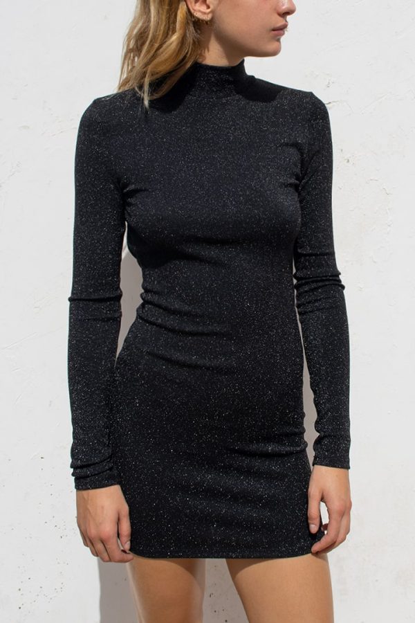 Vestito lupetto, schiena scoperta, maniche lunghe, tessuto in lurex, lunghezza corta, vestibilità slim.