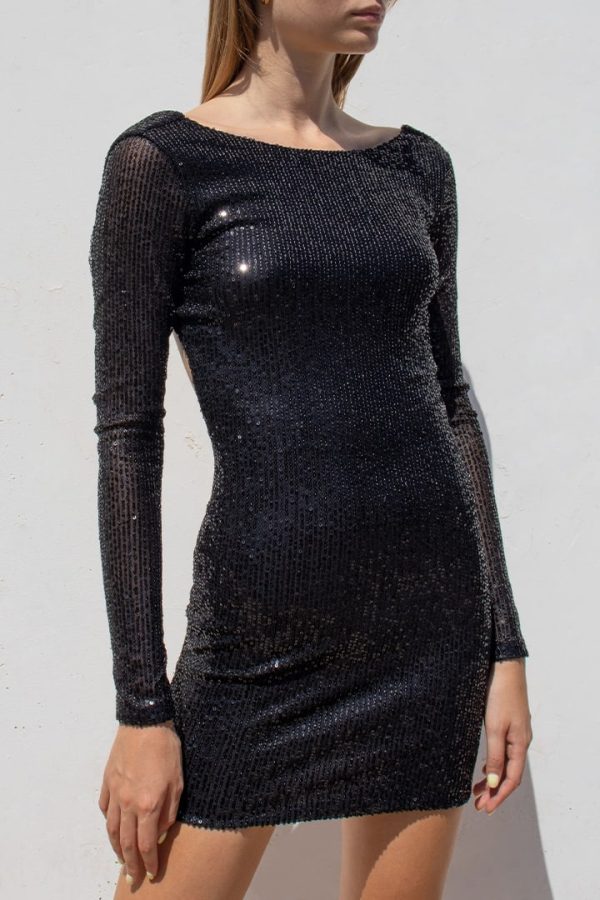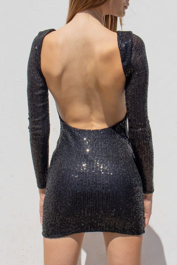 Vestito schiena scoperta, girocollo, maniche lunghe, tessuto in paillettes, lunghezza corta, vestibilità slim