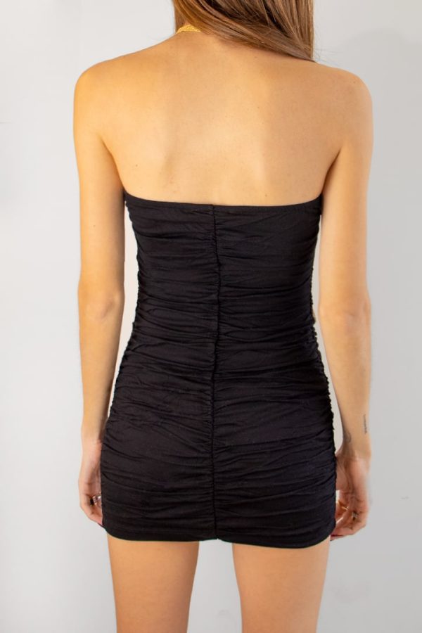 Vestito tubino, modello arricciato, tessuto lurex, smanicato, lunghezza corta, vestibilità aderente.